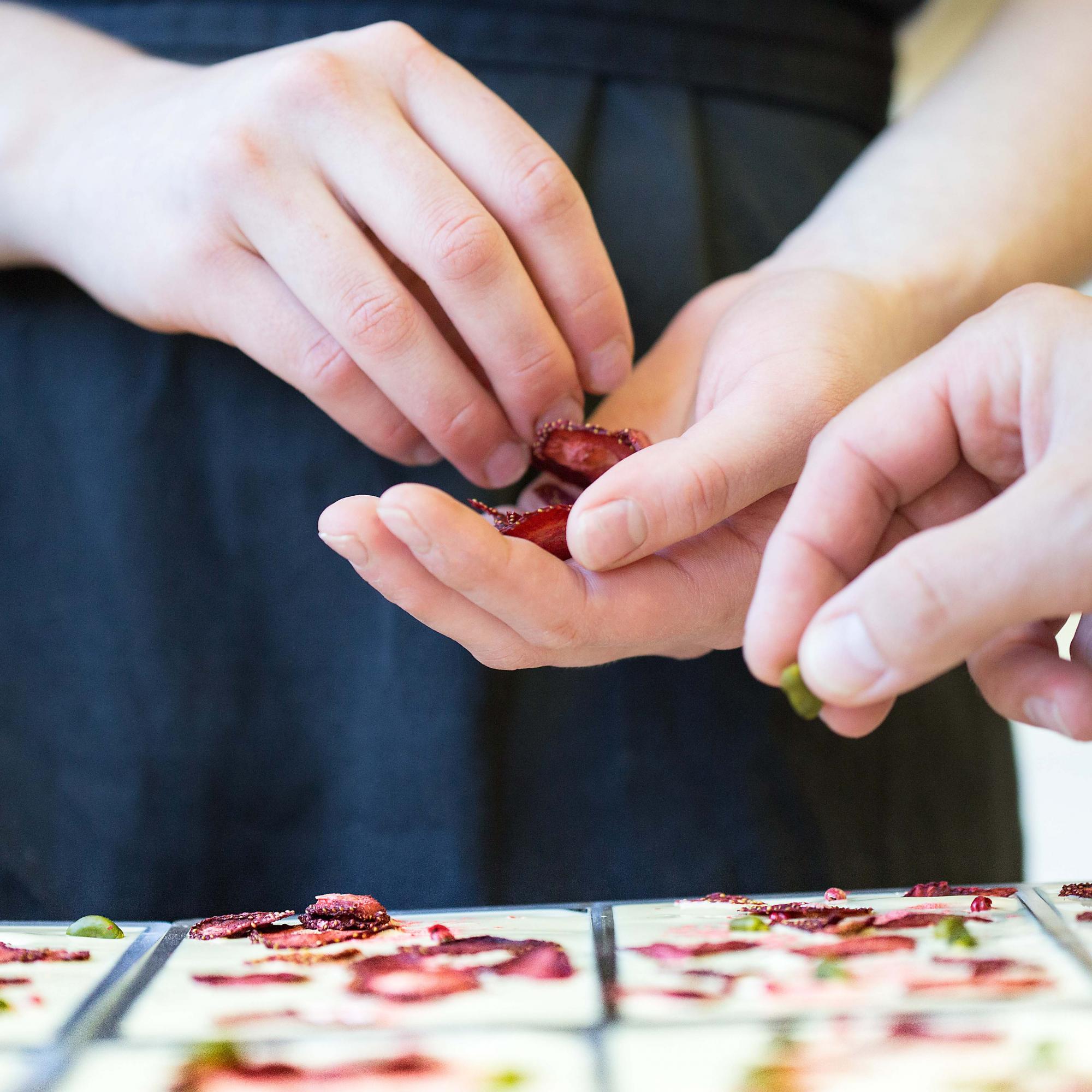 Den krönenden Schlusspunkt setzt die Manufaktur. Hier werden kunstvolle Pralinen und gefüllte Schokoladen hergestellt. Seidig zarte Füllungen und allerlei Knuspriges veredeln zartschmelzende Schokoladen.